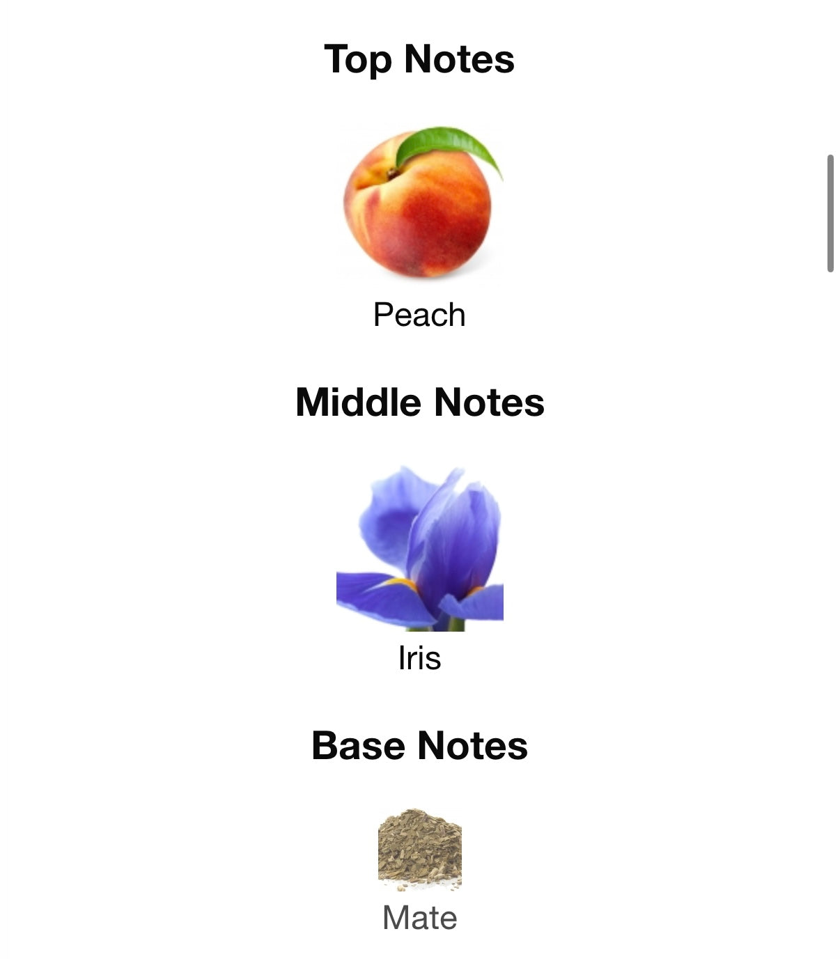Sweet juicy peach, a delicate and powdery iris adds an air of refined floral elegance , warm green maté leaves leaving a soothing trail with a touch of woody herbaceousness