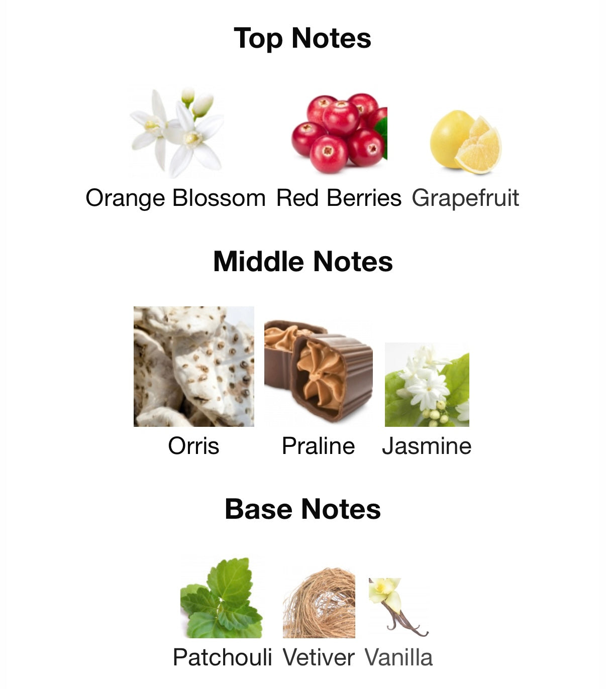 Notes: Grapefruit, Raspberry, orange Flower, Orris , Praline , Jasmine , Vanilla , Patchouli, vetiver